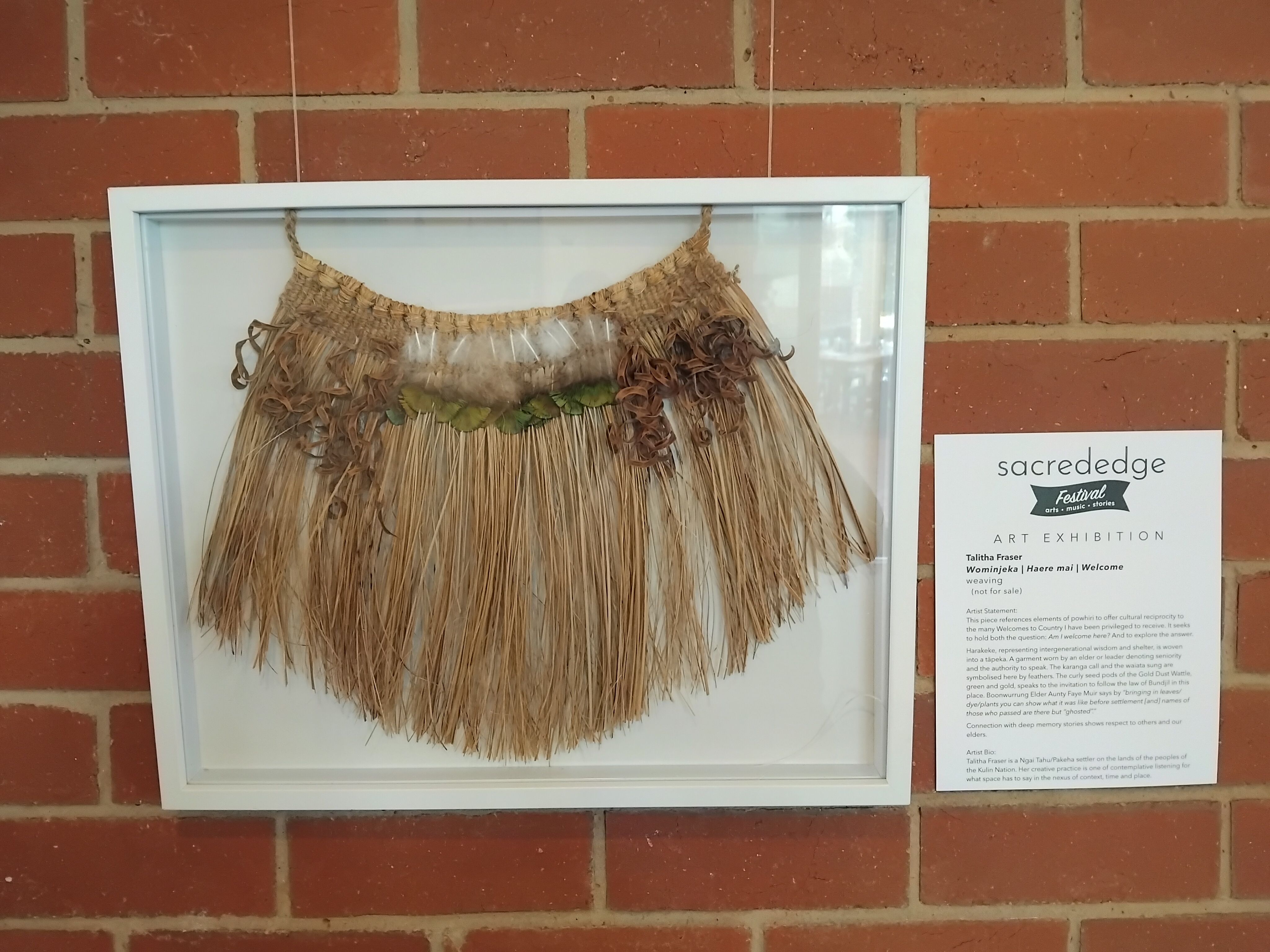 Harakeke, representing intergenerational wisdom and shelter, is woven into a tāpeka. A garment worn by an elder or leader denoting seniority and the authority to speak. The karanga call and the waiata sung are symbolised here by feathers. The curly seed pods of the Gold Dust Wattle, green and gold, speaks to the invitation to follow the law of Bundjil in this place. Boonwurrung Elder Aunty Faye Muir says by“bringing in leaves/dye/plants you can show what it was like before settlement [and] names of those who passed are there but “ghosted”.”
