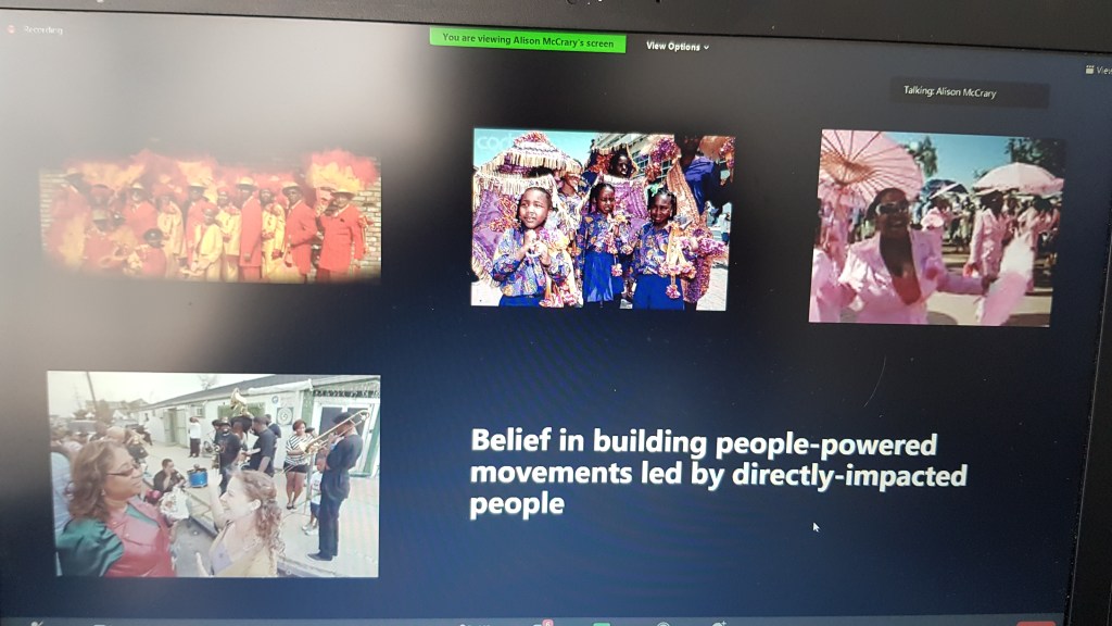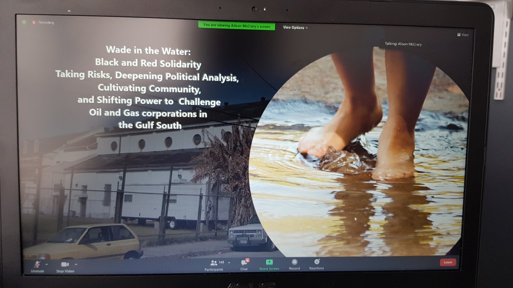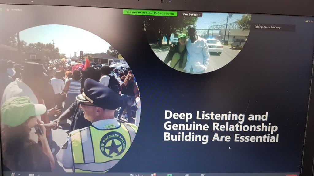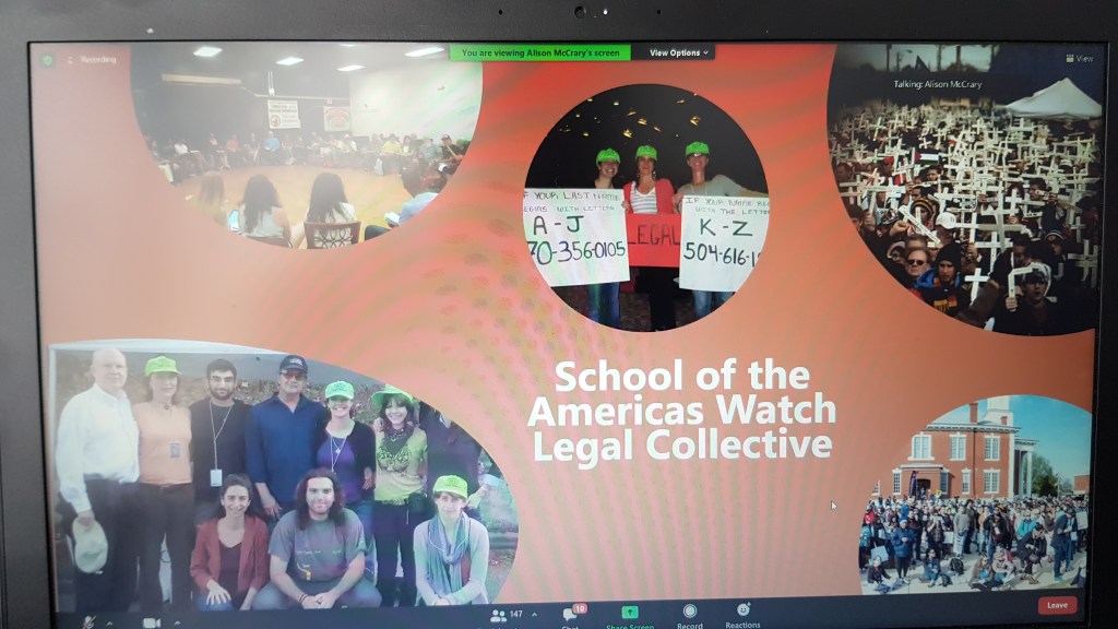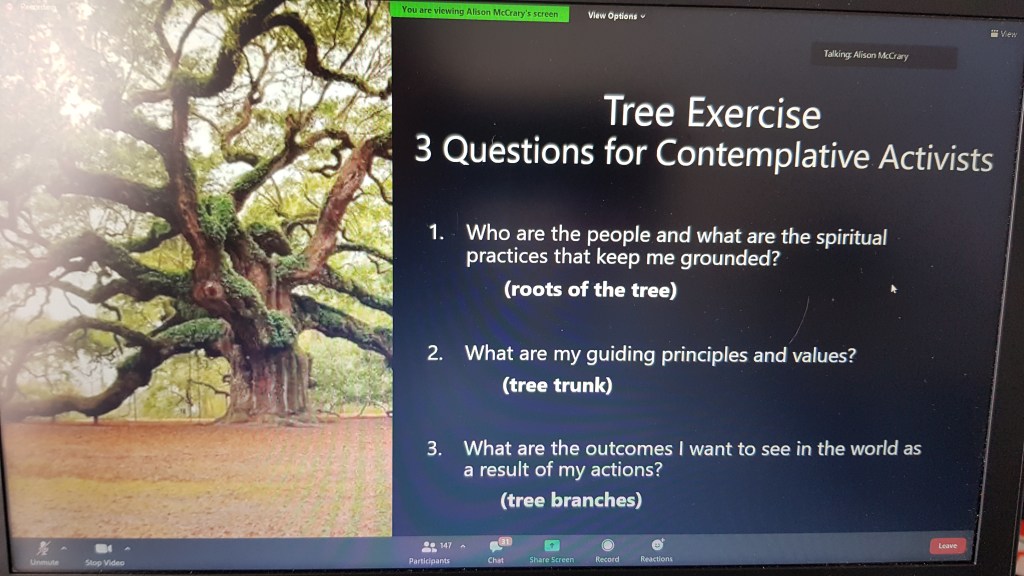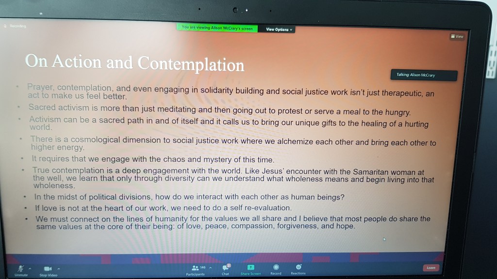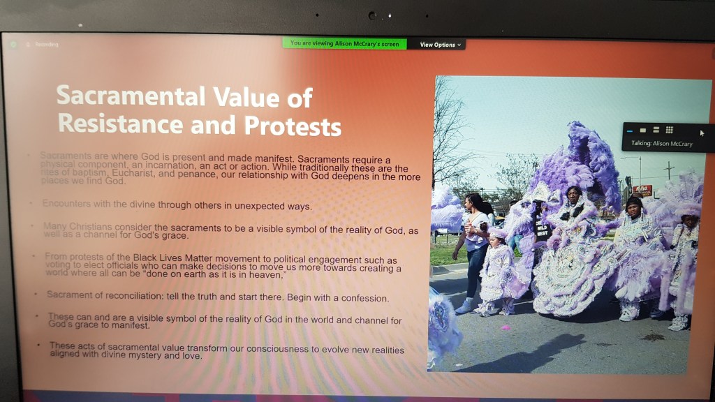 A table is covered with a purple cloth for an altar, though we’re square cubes we are in a circle – we reach out (in zoom, participants are encouraged to hold their hands up as if to make contact with those to either side of them in gallery view). On this morning we have a memorial for Ross Kinsler and Murphy Davis… we light two candles and have flowers for Gloria, for all those ‘gone to glory’ to ‘join the cloud of witnesses’. The table is set. Invite people at the table to share stories… we hear remembrances from people who know these elders well as a litany of names rolls down the chat.