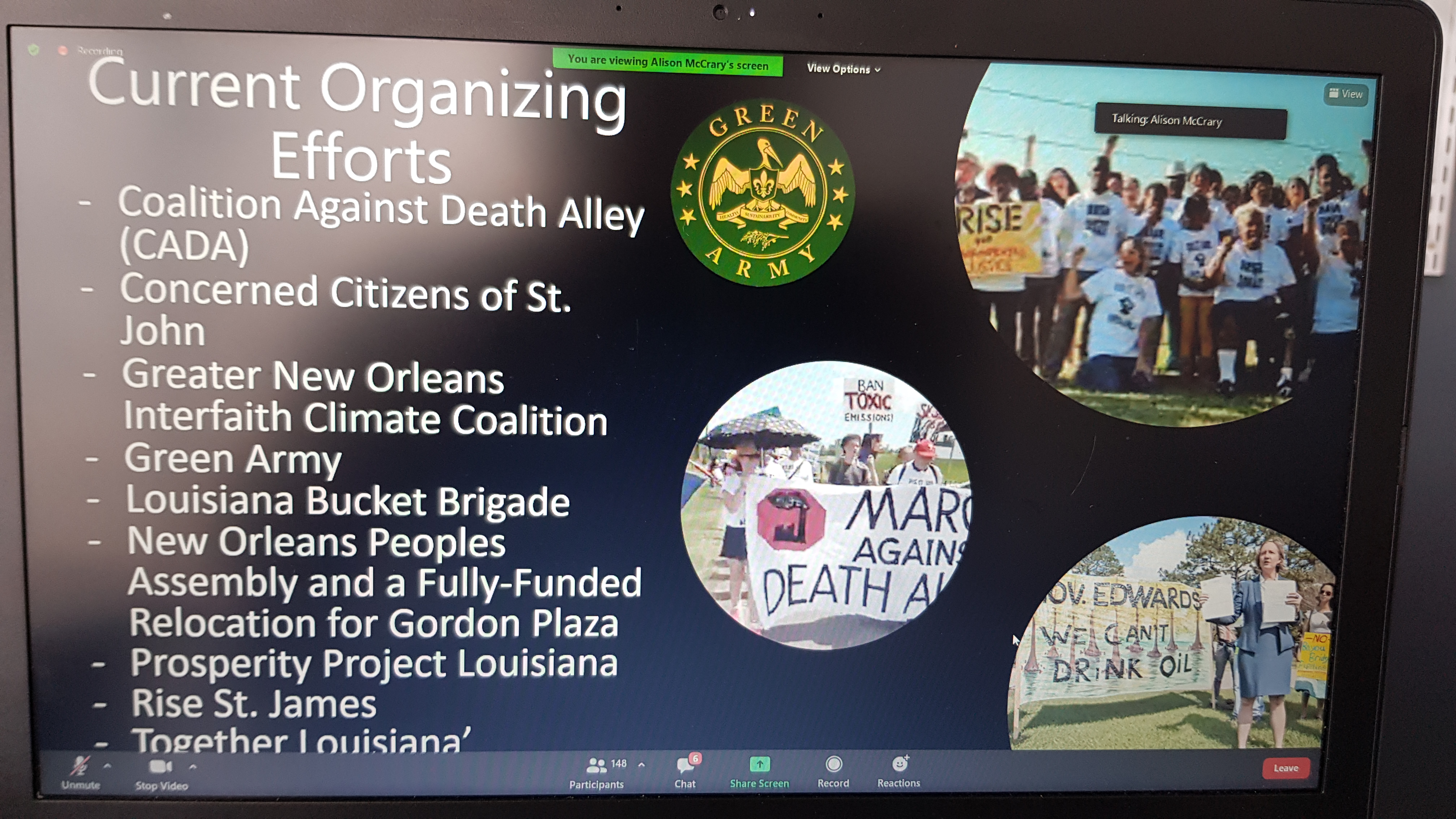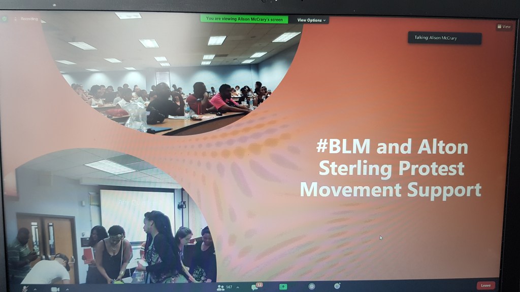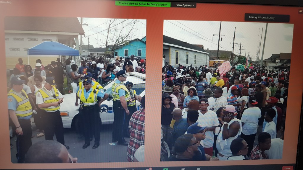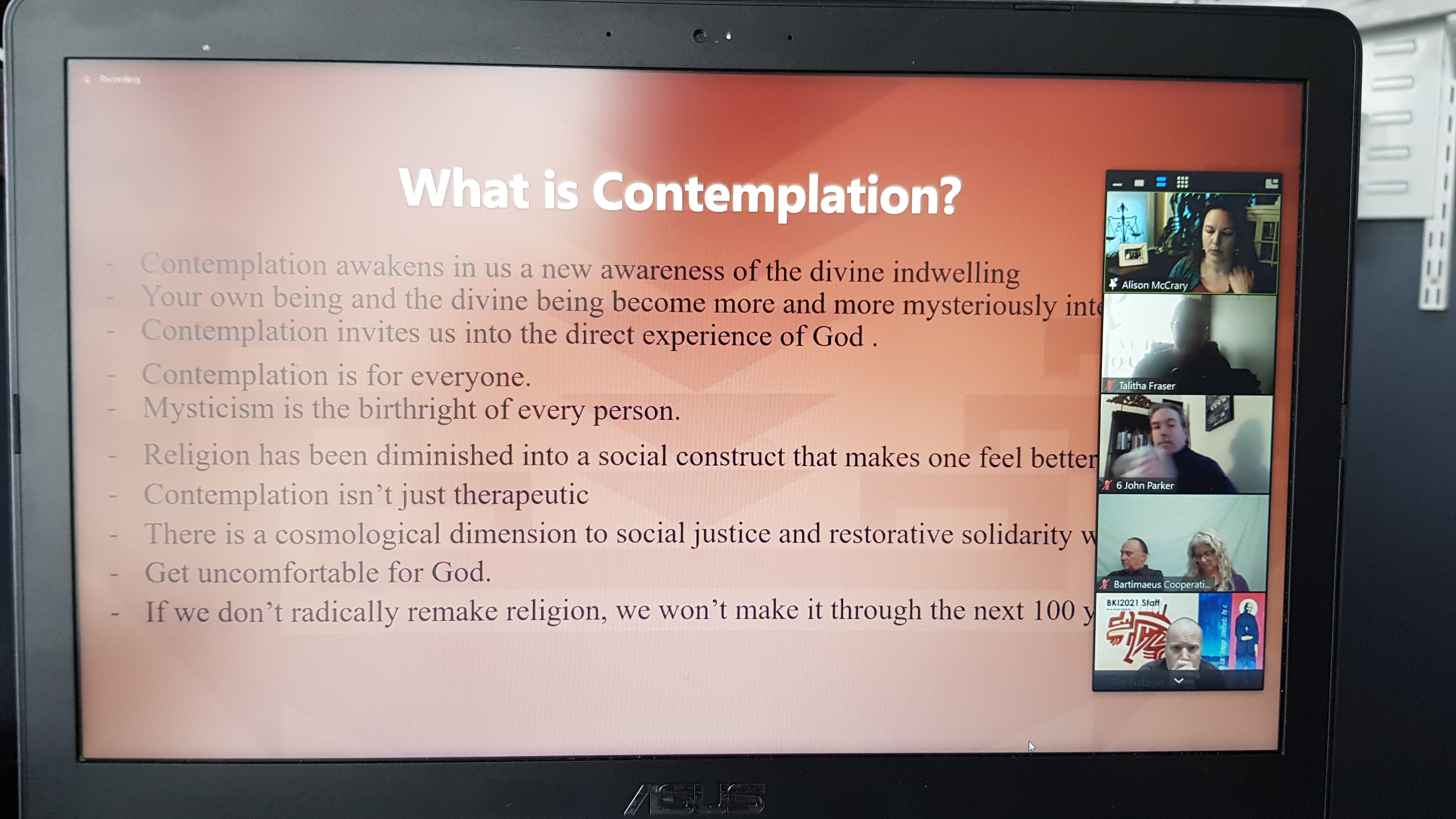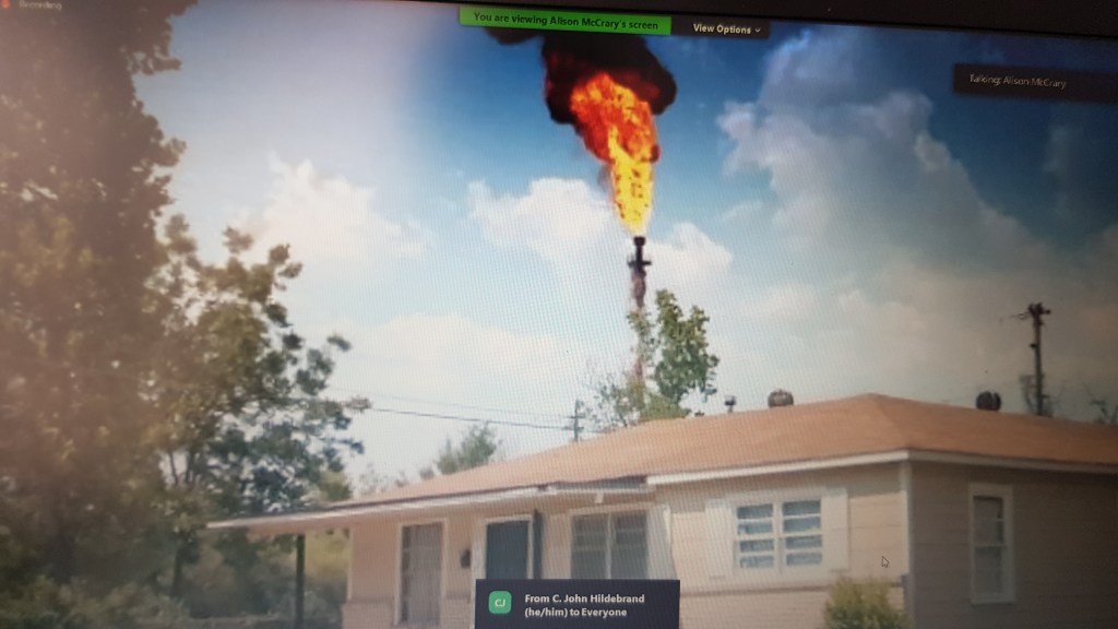 A table is covered with a purple cloth for an altar, though we’re square cubes we are in a circle – we reach out (in zoom, participants are encouraged to hold their hands up as if to make contact with those to either side of them in gallery view). On this morning we have a memorial for Ross Kinsler and Murphy Davis… we light two candles and have flowers for Gloria, for all those ‘gone to glory’ to ‘join the cloud of witnesses’. The table is set. Invite people at the table to share stories… we hear remembrances from people who know these elders well as a litany of names rolls down the chat.