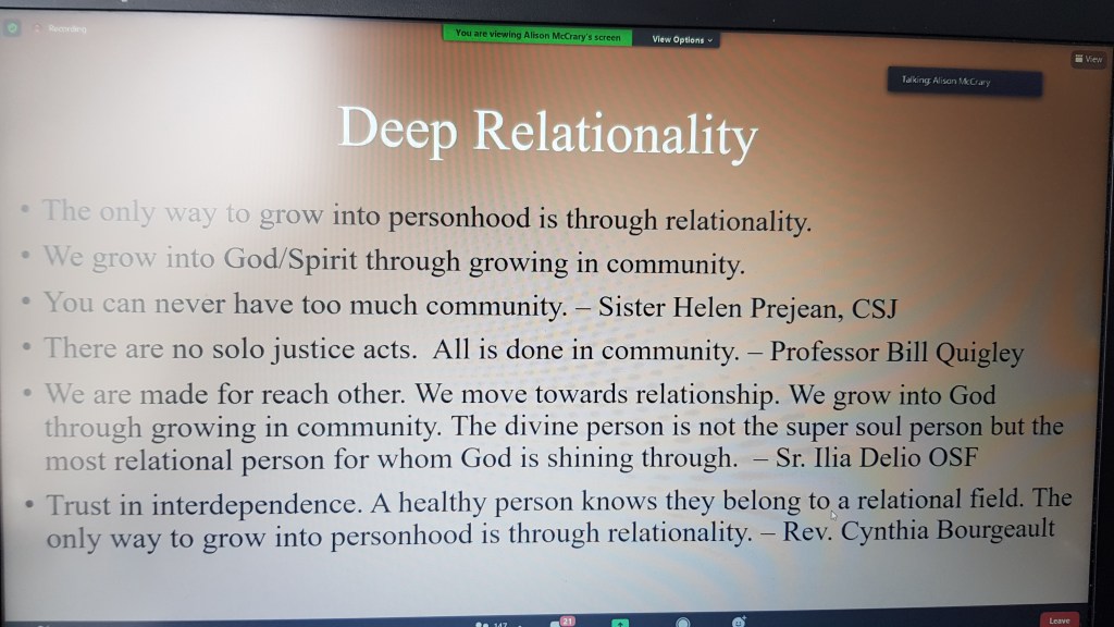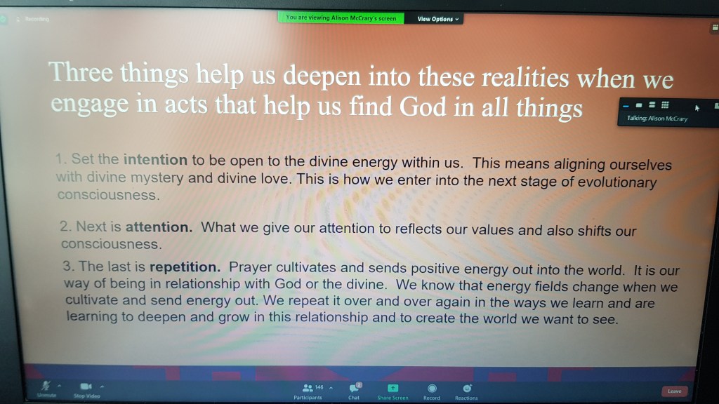 We were attempting this reflection by zoom which is not an easy medium to hold space for people speaking in chorus/at the same time. We asked folks to share something they miss or feel the lack of and something new they’ve discovered, enjoyed or had more time to appreciate and captured those words on pegs.
