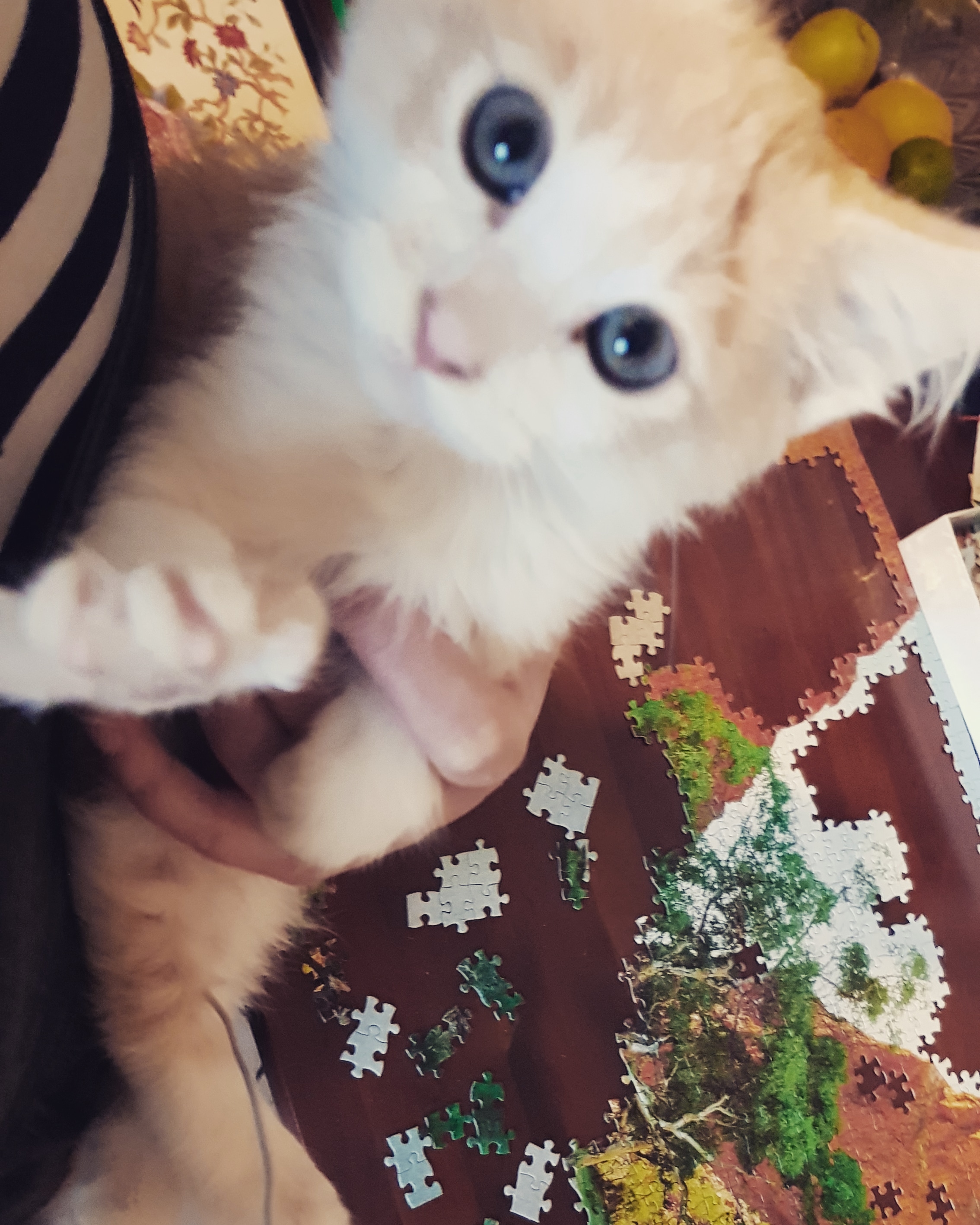 Skids across the table. Half the almost-complete puzzle slides off and he just peers down at it on the floor. There’s no fear here. What if we looked at our mistakes as exploring? What if we looked at others’ mistakes as exploring? #fear #mataku