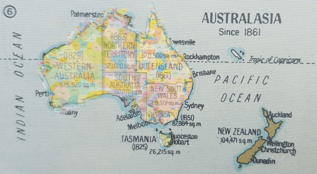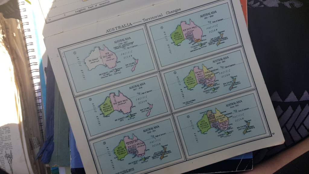 I love old books and paper, I’m going to use some of these as a lens: First up is the Collins Australian Clear School Atlas New and Revised Edition.