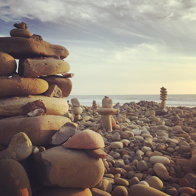 Artist Manuel Cisneros, a native of Guanajuato, Mexico, came to California 12 years ago. The physical labor of moving large boulders around was satisfying, and the contemplative nature of balancing and composing his sculptures fed his soul. Often, he doesn’t know what a sculpture is going to look like until it’s finished; he enjoys the way the rocks, wind and ocean waves work their own magic on him. (quote from the Ventura County Reporter, 12/24/2014)
